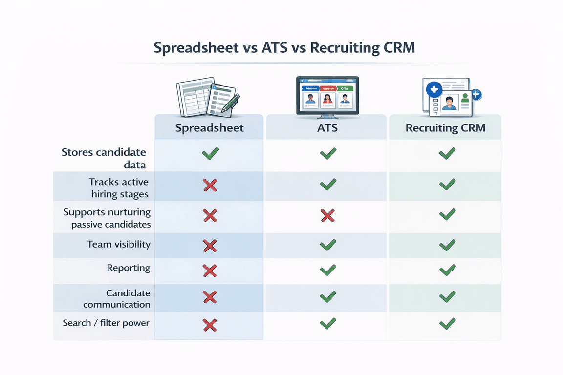 An ATS is mainly for managing applicants and hiring workflows. A recruiting CRM is more focused on sourcing, nurturing, and relationship-building over time.